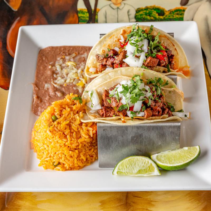 Lunch $14.00 | Dinner $20.00 • Three corn tortillas with your choice of meat served with mole sauce, topped with melted cheese, and served with rice and refried beans, your choice of chicken or shredded or ground beef or vegetables.