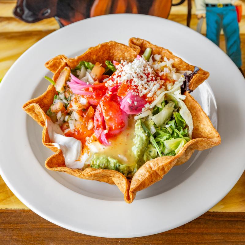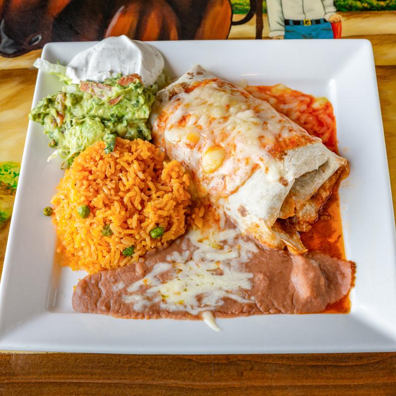 Lunch $13.00 | Dinner $18.00 | Steak $24.00 • 12" flour tortilla stuffed with beans, rice, cheese, beef, or chicken topped with red sauce, sour cream, cheese, and guacamole. Your choice of chicken or shredded or ground beef or vegetables or carnitas.