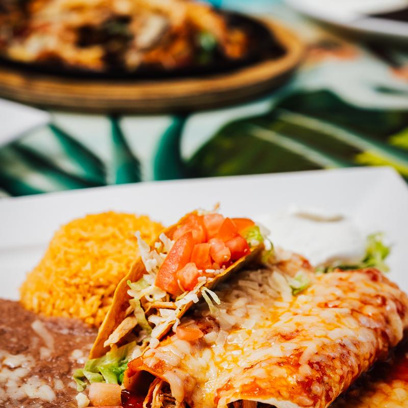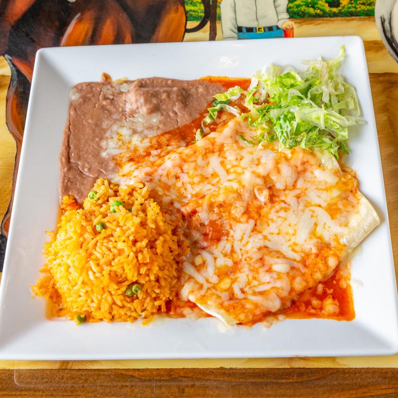 Lunch $13.00 | Dinner $18.00 • Three corn tortillas with your choice of meat served with red sauce, topped with melted cheese, and served with rice and refried bean,s your choice of chicken or shredded or ground beef or vegetables.