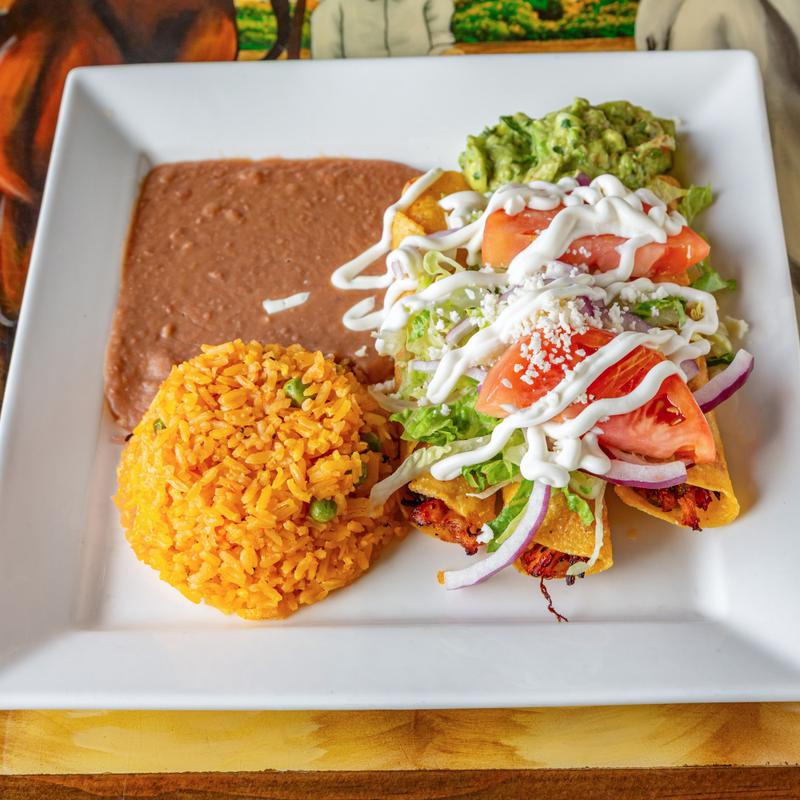 Three deep-fried rolled corn tortillas stuffed wth choice of chicken or shredded beef and topped with lettuce, tomatoes, onions, and Mexican sour cream and green sauce. Served with rice and beans
