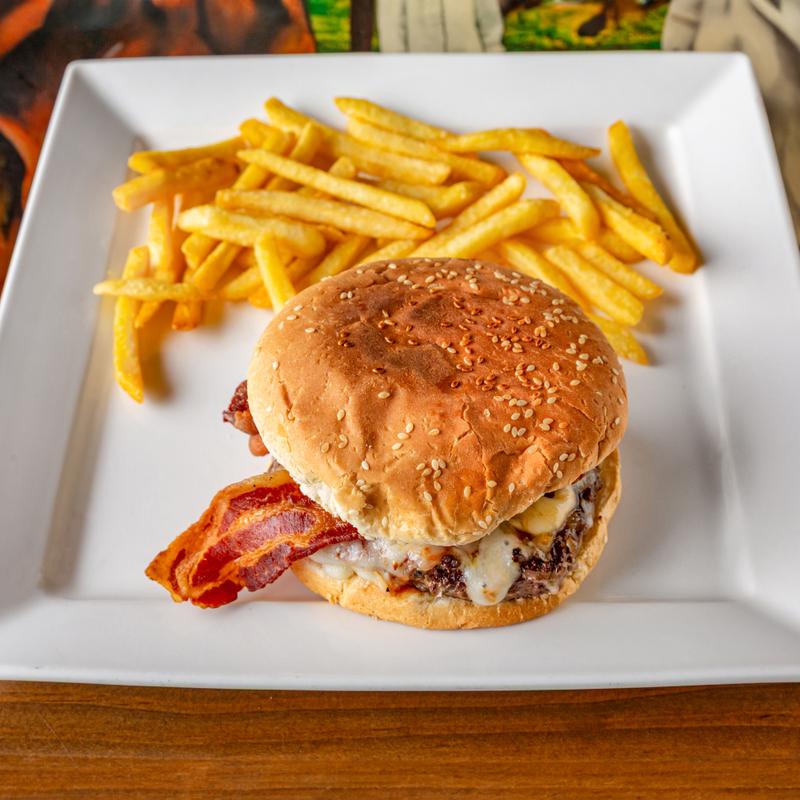 8 oz. grilled juicy Angus Burger with melted Monterey Jack cheese, smoked BBQ sauce, onions, bacon and fries. Served with French fries.