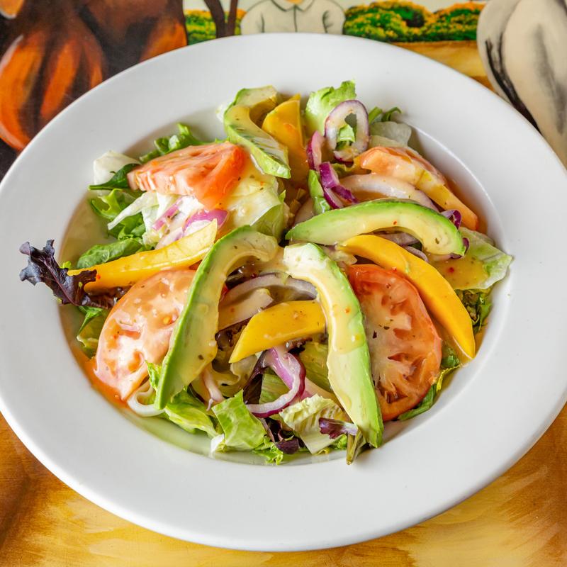 Avocado stuffed with shrimp, light chipotle mayo dressing, tropical fruit, and fried sweet plantain.